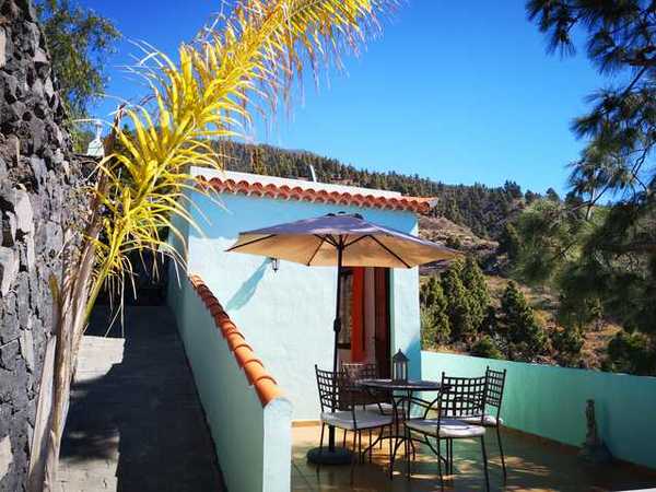 Es hat vorne zum Tal hin eine hübsche Terrasse mit fantastischem Blick, einer Sitzgruppe mit Sonnenschirm und eine seitlich am Haus entlanggehende Verlängerung, auf der sich die beiden Sonnenliegen befinden.Das Haus wird über diese Terrasse betreten und verfügt über zwei Räume und ein Bad. Im ersten Raum befindet sich medias in res der Wohnbereich, mit Sofa, Tisch und Fernseher, anschließend der Essbereich und am Kopfende die hübsche helle Einbauzeile der Küche. Über den Flur, von dem rechts das Duschbad abgeht, kommt man ins Schlafzimmer, welches mit zwei Einzelbetten, Nachttischen und einem Kleiderschrank ausgestattet ist. Das Fenster zeigt gen Südwesten mit herrlichem Blick auf die Cumbre und die Seitenausläufer des Tals. Sobald die ersten Sonnenstrahlen über die Bergkette lugen, scheinen Sie auch ins Häuschen.