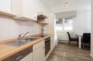 Küche mit Ceranfeld, Kühlschrank mit Gefrierfach, Backofen, Spülmaschine, Toaster, Wasserkocher, Kaffeemaschine