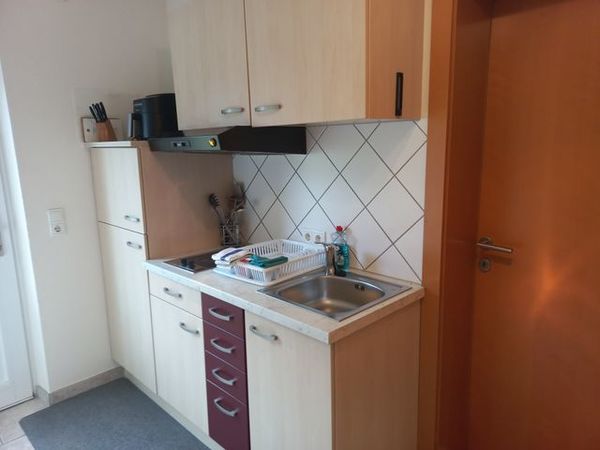Fewo im Parterre, barrierefrei zugänglich. kleine Küche ausgestattet mit E-Herd, Kühlschrank mit Gefrierteil, Kaffemaschine, Wasserkocher, Airfryer, Geschirr und Gläser. Badezimmer mit Dusche/WC, Waschmaschine. Wohn/Schlafraum mit 2 getrennten Betten, Tisch mit Stühlen und Bank, Couch, TV, Parkplatz vorhanden.