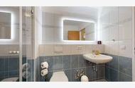 Badezimmer mit großer Dusche, WC und Föhn
