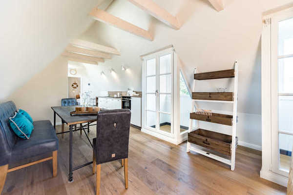 Im Dachgeschoss des denkmalgeschützten Haupthauses befindet sich ein absolutes wohnliches Highlight. Die 70 qm große Dreiraum-Wohnung mit Loftcharakter besticht mit ungewöhnlichen Einrichtungsideen. Erreichbar ist die Wohnung über das Obergeschoss mit einem eigenen Treppenaufgang.