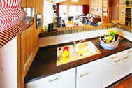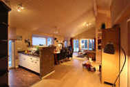 Der helle Wohn- und Essbereich des barrierefreien Hauses ist mit einer offener Küche und einem Kaminofen ausgestattet. Die 3 Schlafzimmer des Hauses laden mit behaglichen Doppelbetten zu erholsamem Schlafen und Träumen ein. Der Hems (Schlafboden) ist mit seinen beiden Schlafmatratzen eine weitere Trauminsel für eine 7. und 8. Person.