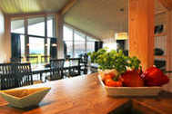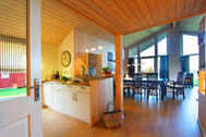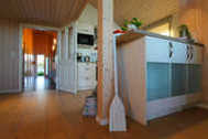 Der helle Wohn- und Essbereich des barrierefreien Hauses ist mit einer offener Küche und einem Kaminofen ausgestattet. Die 4 Schlafzimmer des Hauses laden mit behaglichen Doppelbetten zu erholsamem Schlafen und Träumen ein. Der Hems (Schlafboden) ist mit seinen beiden Schlafmatratzen eine weitere Trauminsel für eine 9. und 10. Person.
