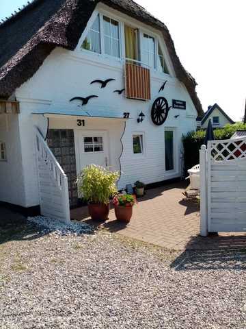Die Ferienwohnung befindet im EG mit einer eigenen, großzügiggen möblierten Terrasse, zu der auch ein Strandkorb gehört.