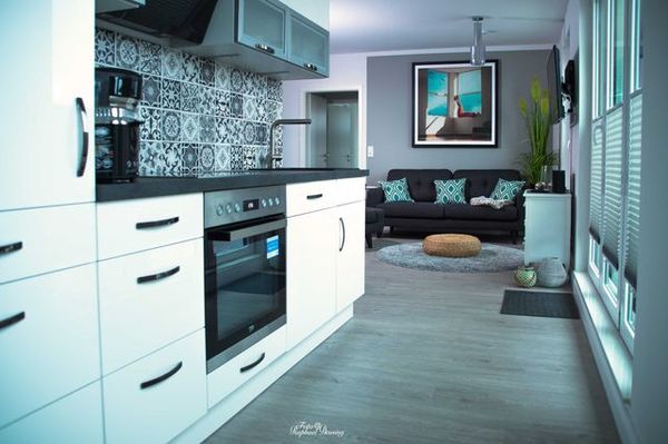 Die komplette Stirnseite des Wohnbereiches sowie der Küche verfügt über eine verglaste Terrassenfront und versprüht sogleich beim Betreten des Appartements das Gefühl, dem Ostseehimmel ganz nah zu sein.