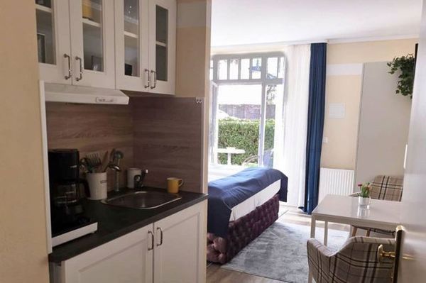 Das Studio verfügt über eine kleine Küche mit zwei Platten Induktionsfeld, Kühlschrank mit Gefrierfach, Kaffeemaschine, Wasserkocher, Toaster sowie einer kompletten Geschirr Ausstattung und Kochgeschirr. An der Wand befindet sich ein Flachbild TV, kostenfreies WLAN ist verfügbar. Die kleine ebenerdige Terrasse lädt zu einer gemütlichen Pause ein.