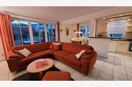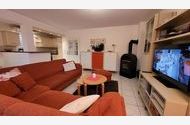 Die großzügige Ferienwohnung im Erdgeschoss mit gehobenem Ambiente betreten Sie über einen eigenen Hauseingang. Sie verfügt über ein großes Wohnzimmer mit gemütlicher Couchlandschaft und Kaminofen sowie einen hellen Essbereich mit integrierter Markeneinbauküche. An den mit hellen Villeroy&Boch-Fliesen ausgelegten sonnigen Wohnraum schließt sich eine große, nach Südwesten ausgerichtete überdachte Terrasse mit Gartenmöbeln an, auf der Sie entspannt die lauen Sommerabende genießen können. Die moderne Küche in hellem Ahorn besteht aus einem Cerankochfeld mit Backofen, Geschirrspüler, Mikrowelle, Kühl-Gefrierkombination, Kaffeemaschine, Wasserkocher, Toaster sowie reichlich Geschirr, Töpfen uvm..