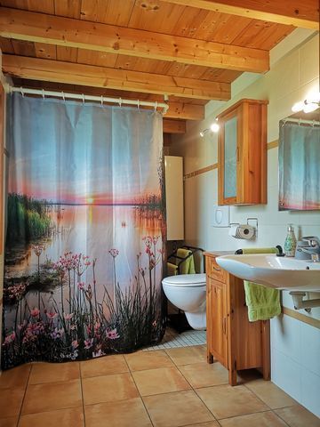 Das Badezimmer ist mit ebenerdiger Dusche, Waschbecken und WC eingerichtet.