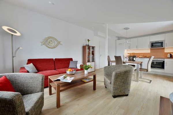 Die Ferienwohnung "Strandkorb" verfügt über ein Doppelbett im Schlafzimmer und eine Schlafcouch im Wohnbereich. Ein Kinder-/ Babybett kann zugestellt werden.