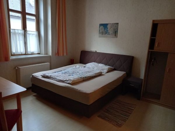 Wohnung im 1. Stock, Wohn-Schlafzimmer mit Doppelbett, "Vorraum" mit Einzelbett, Küche, Du/WC, voll ausgestattet inkl. Wäsche, Küche mit E-Herd, Backrohr, Mikrowelle, Waschmaschine und Trockner auf der Etage