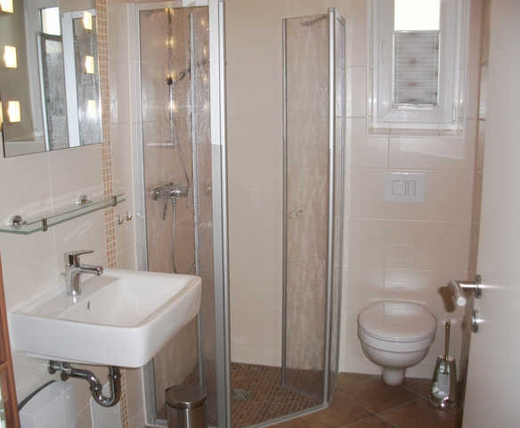Das Bad mit Fenster hat eine Dusche und ein WC.