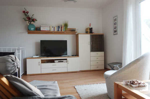 Das Wohnzimmer ist mit einer Couch sowie einem Flachbildfernseher und einem DVD / Blu-Ray Player ausgestattet.