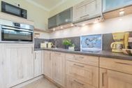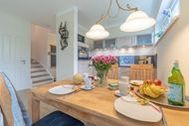 Der großzügig gestaltete Wohn-Essbereich befindet sich ebenfalls im Erdgeschoss. Die Einbauküche im klassischen Landhausstil sowie div. Küchengeräte wie Toaster, Eierkocher, Kaffeemaschine, Wasserkocher, Mikrowelle und Herd mit Cerankochfeld und Backofen bieten ambitionierten Hobbyköchen, auch im Urlaub, die Möglichkeit Essen nach eigenen Wünschen zu kochen. Im Küchenbereich rundet ein massiver Holztisch inkl. vier Stühlen das freundlich warme Design ab.