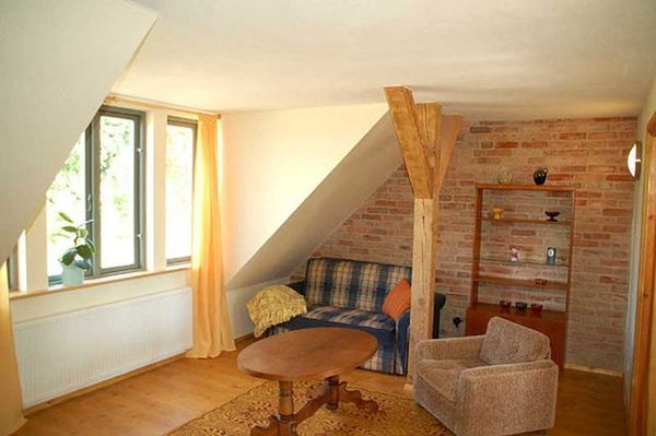 Die große Wohnung für bis zu 4 Personen liegt im Obergeschoss des Hauses. Balken & Schrägen verleihen ihr ein gemütliches Ambiente. So wohnen Sie: