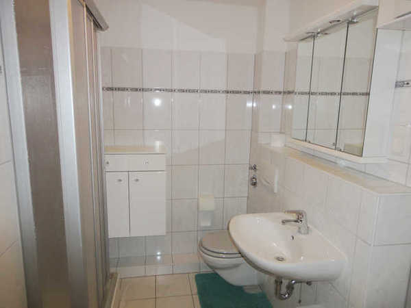 Das geflieste Bad ist mit einer Dusche, einem Waschtisch und einem WC ausgestattet.