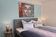 Das Schlafzimmer lädt mit einem komfortablen Boxspringbett für zwei Personen und einem LED-TV an der Wand zu kuscheligen Filmabenden im Bett ein.