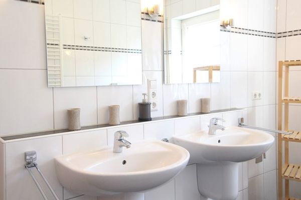 Im modernen Bad mit Tageslicht finden Sie eine ebenerdige Dusche, 2 Waschbecken und natürlich auch ein WC.