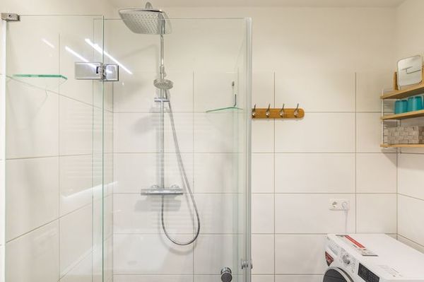 Das Bad ist mit einer barrierefreien Dusche/Regendusche und einem WC ausgestattet. Die Wasch-/ Trocknerkombi hier kann kostenfrei genutzt werden.