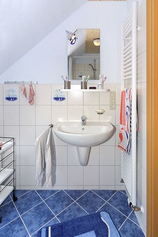 Größe ca. 50 Quadratmeter, Wohnraum mit integrierter Küche, Schlafzimmer, zweites separates Schlafzimmer/Kinderzimmer, Badezimmer mit Dusche, Waschtisch und WC, Obergeschoss, optimal für 2 bis 3 Personen und zusätzlich ein Kleinkind.