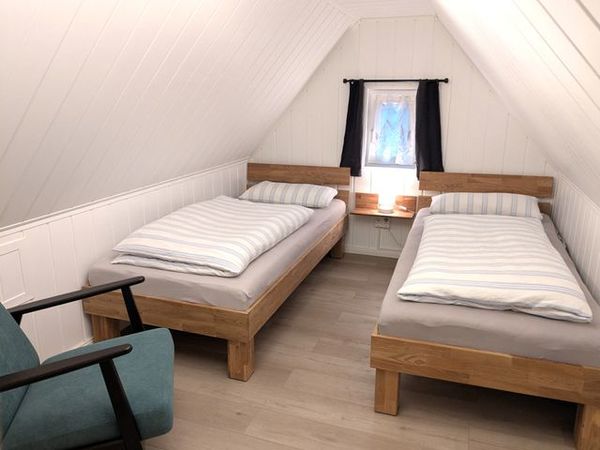 Das Haus ist folgendermaßen ausgestattet: Komplett ausgestattete offene Küche (u. a. mit Herd und Backofen, Kühlschrank, Geschirrspüler, Mikrowelle, Kaffeemaschine, Wasserkocher, Toaster), Schlafzimmer im 1. Obergeschoss mit zwei Einzelbetten (0,90m x 2,00m), Fernseher, Bad mit Dusche und WC, Terrasse mit Sitzgelegenheit, großer Garten mit Sitzecke, Holzkohlegrill und Parkplatz auf dem eingezäunten Grundstück. Bitte beachten Sie, dass eine steile Treppe zum Schlafzimmer führt. Haustiere sind im Bungalow nicht erlaubt. Das Wäschepaket (Bettwäsche und Handtücher) kann für 25,00 EUR pro Person hinzugebucht werden.