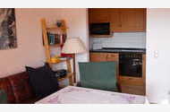 Dem Wohnzimmer ist die Küchenzeile angegliedert und man hat von ihm Zugang zur Terrasse. In ihm sind für kurzzeitige Aufenthalte zwei Aufbettungen möglich.
